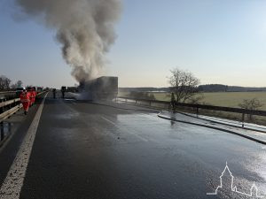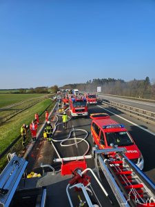 Nach Ankunft der ersten Kräfte bestätigte sich die Lage bei der in Fahrtrichtung Nürnberg eine Sattelzugmaschine und ein Teil des Aufliegers in Vollbrand standen. Gute Unterstützung erhielten die ersten Kräfte durch einen Kameraden der Berufsfeuerwehr Nürnberg privat vor Ort, welcher uns mit Informationen einwies und kurzzeitig unterstützte, dieser setzte auch den vorangegangenen Notruf ab – vielen Dank.