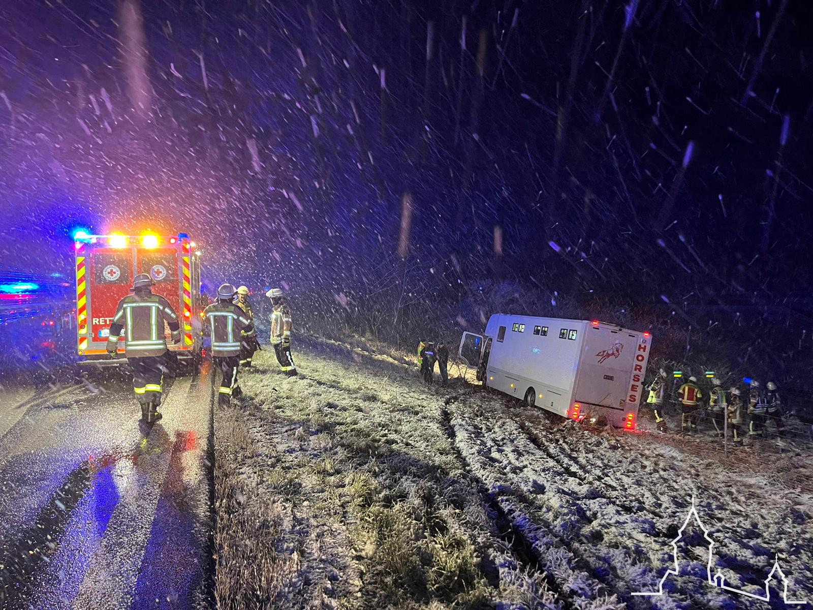 Gegen 01:25 Uhr wurden wir zu einem von der Fahrbahn abgekommenen Pferdetransporter alarmiert. Dieser war im Schneetreiben auf der A6 von der Fahrbahn abgekommen und im Graben zum stehen gekommen. Glücklicherweise wurde weder eines der sieben Tiere noch die beiden Fahrer verletzt. Da weder Betriebsstoffe austraten, noch das Fahrzeug drohte umzustürzen, beschränkte sich unsere Tätigkeit auf die Absicherung der Einsatzstelle.